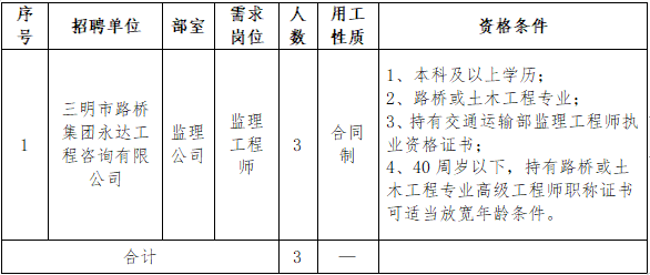 (一)公告。招聘崗位、人數(shù)、任職資格等信息在“三明市路橋集團(tuán)”官網(wǎng)(www.jhweili.com)、眾聯(lián)人才招聘網(wǎng)(www.zlrczp.com)及一覽監(jiān)理英才網(wǎng)(www.jljob88.com)向社會(huì)統(tǒng)一公告。