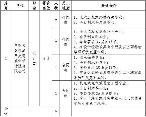 (二)報名。采取網(wǎng)絡報名方式,請應聘者下載填寫《三明市路橋集團有限公司公開招聘工作人員報名登記表》(附件),投遞至郵箱smslqjt@163.com(文件命名為“姓名+應聘崗位”)。報名截止時間為2022年4月8日。