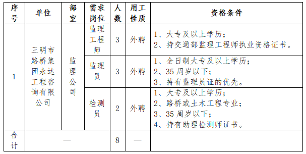 (一)公告。招聘崗位、人數(shù)、任職資格等信息在 “三明市路橋集團(tuán)”官網(wǎng)(www.jhweili.com)、眾聯(lián)人才招聘網(wǎng)(www.zlrczp.com)、“三明海峽人才網(wǎng)”、“一覽英才網(wǎng)”官網(wǎng)向社會(huì)統(tǒng)一公告。
