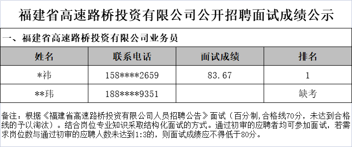 根據(jù)《省高速路橋投資有限公司人員招聘公告》,現(xiàn)將省高速路橋投資有限公司公開招聘工作人員面試成績及排名情況公示如下: