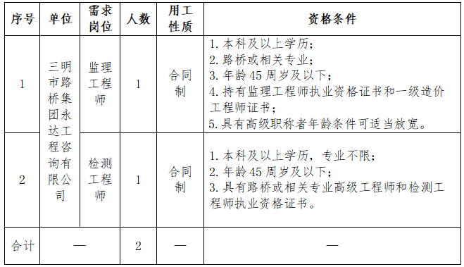 (一)公告。招聘崗位、人數、任職資格等信息在 “三明市路橋集團”官網(www.jhweili.com)向社會統(tǒng)一公告。