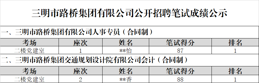 市路橋集團公開招聘筆試環(huán)節(jié)已于2023年11月3日完成,現(xiàn)將筆試成績予以公示: