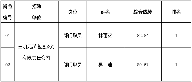 三明市交通建設(shè)發(fā)展集團(tuán)有限公司公開(kāi)招聘項(xiàng)目公司職員擬入用人員公示