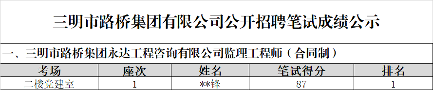 市路橋集團公開招聘筆試環(huán)節(jié)已于2024年8月21日完成,現(xiàn)將筆試成績予以公示: