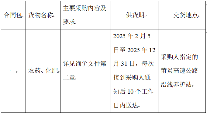 三明市路橋集團(tuán)昌盛公路工程有限公司承接莆炎高速三明境日常養(yǎng)護(hù)工作,現(xiàn)需要采購(gòu)一批農(nóng)藥、化肥,現(xiàn)對(duì)上述物資及服務(wù)進(jìn)行詢(xún)價(jià)采購(gòu),歡迎合格報(bào)價(jià)人對(duì)該采購(gòu)進(jìn)行報(bào)價(jià)。