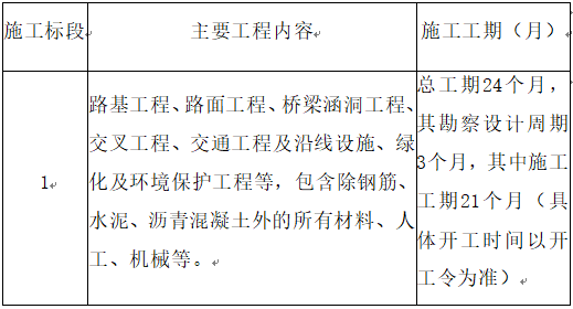 2.3工期要求:總工期24個月,其勘察設(shè)計周期3個月,其中施工工期21個月(具體開工時間以開工令為準(zhǔn))。