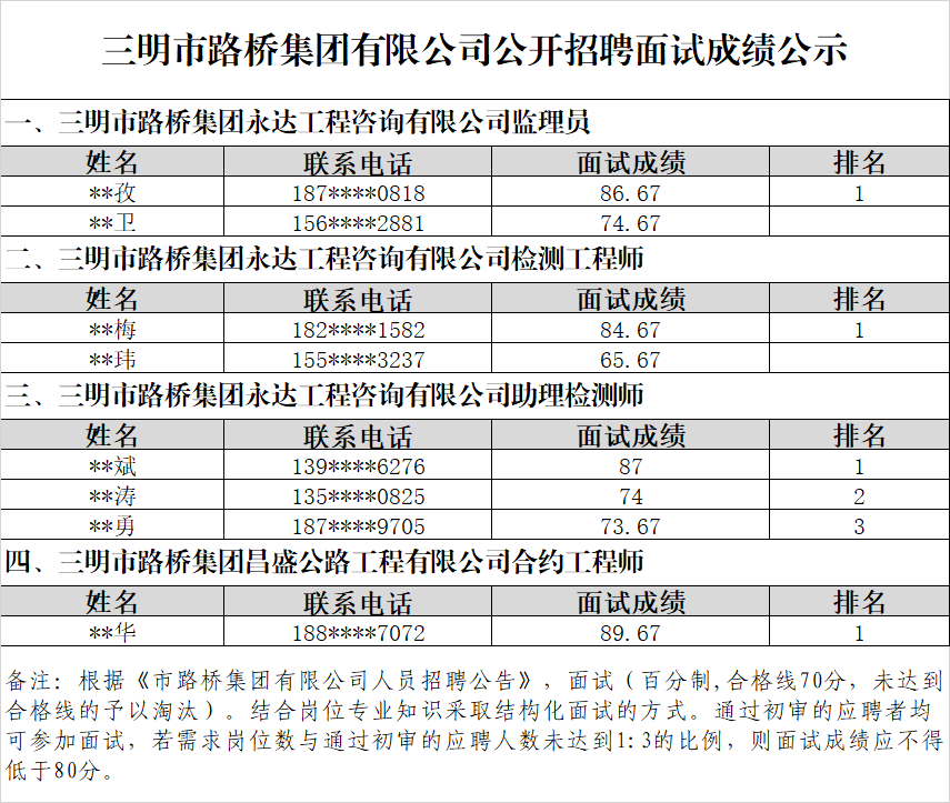 三明市路橋集團(tuán)有限公司項(xiàng)目用工人員招聘面試環(huán)節(jié)已于2025529日完成,現(xiàn)將面試成績(jī)予以公示: