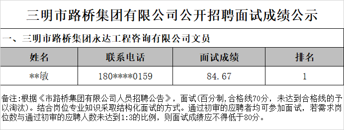 三明市路橋集團有限公司項目用工人員招聘面試環(huán)節(jié)已于2025年7月23日完成,現(xiàn)將面試成績予以公示: